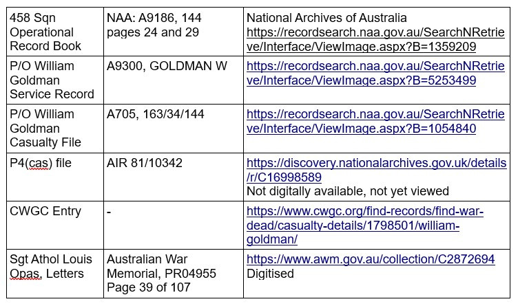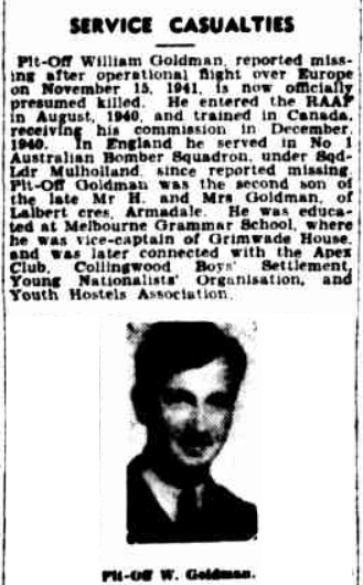 Four days later, 19 November at 6pm, Bill’s mother Mrs Amelia Goldman received the telegram informing her that her son was missing on operations. This letter was followed up on 2 January 1942 to state “The last time contact was made with the aircraft was at the estimated time of arrival at the target, but after this time nothing further was heard from it, and although searches were made no trace of the aircraft or of any member of the crew could be found.” 6 months later, the Air Board wrote to tell Mrs Golman that, for official purposes, her son William Goldman was now presumed dead.