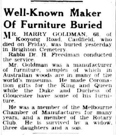 Bill Goldman was born in Melbourne on 28 May 1912 to Harry and Amelia Goldman of Kooyong Road, Caulfield, South-East Melbourne. As shown in the newspaper clipping announcing him as a casualty, Bill studied at Melbourne Grammar School and was associated with several groups. On enlistment to the RAAF in August 1940, Bill stated his occupation as ‘Manager Furniture & Joinery’. This is evidently the business of his late Father and well-known furniture maker Harry Goldman. Made under business names ‘H. Goldman Pty Ltd’ and ‘H Goldman Manufacturing Co’, Harry Goldman’s furniture is still found in museum collections and in auction houses across the world today. The Goldman’s business made furniture and ceremonial pieces for the King and Queen, Dukes and Duchesses of Kent and Gloucester and other members of the Royal Family, as gifts by various Australian organisations and the Prime Minister on behalf of the Australian government.