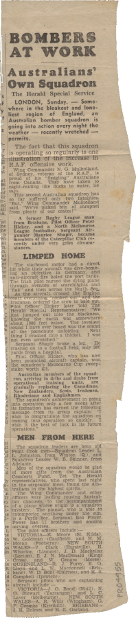 A newspaper article published in ‘The Herald’ (Melbourne) on 10 November 1941 describes the events ‘The starboard motor had a direct hit while their aircraft was dive-bombing an objective in Germany[2], and anti-aircraft fire hole the port tanks. The Irish pilot nursed the dying plane through avenues of searchlights and “flak” and then across the North Sea. As the aircraft crossed the English coast everything “conked out” and the Irishman ordered the crew to bale out. Pilot Officer Hickey late told The Herald Special Representative: “We just jumped out into the blackness, knowing the earth was somewhere about 1000 feet below. The loveliest sound I have ever heard was the sound of the parachute unfolding. Next thing I crashed into a thicket. I was not even scratched. Sergeant Shapir broke a leg. He crashed on to a football field, only 300 yards from a hospital.’ ~ The Herald, Melbourne, 10 Nov 1941, Page 4