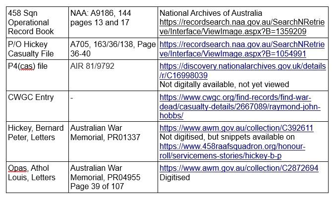 On 22 October 1941, Raymond Philip John Hobbs was the Rear Air Gunner aboard Wellington Mk.IV R1765. The 458 Sqn ORB shows that R1765 took off from RAF Holme-On-Spalding-Moor on 22 October 1941 at 18:30 with Le Harve as the target. It also reports that the aircraft was hit by flak over the target area and returned to England in a crippled condition. Whilst flying over Surrey in England, the crew determined that the aircraft was no longer controllable and gave the order bail out. All the crew managed to do so, with the exception of Sgt Hobbs. The rest of the crew were P/O Sargeaunt, P/O Hickey, P/O Birnie, Sgt Shapir and Sgt Austin.